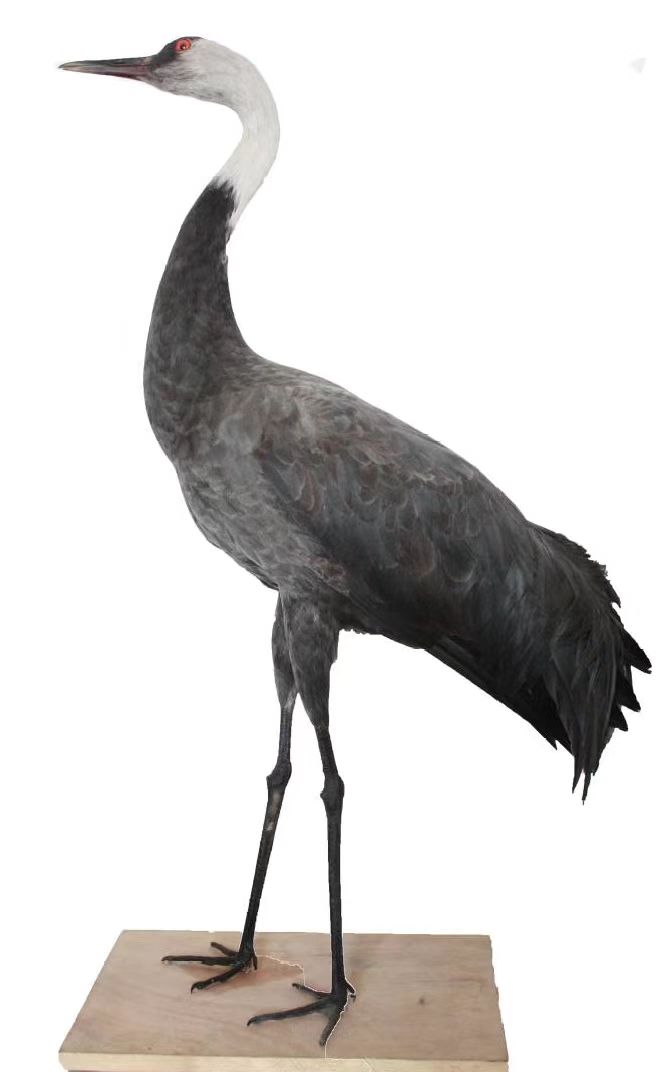 形态:白头鹤为大型涉禽,体长92-97厘米,体重3284-4870克。通体大都呈石板灰色,眼睛前面和额部密被黑色的羽毛,头顶上的皮肤裸露无羽,呈鲜艳的红色,其余头部和颈的上部为白色。两个翅膀为灰黑色,次级和三级飞羽延长,弯曲成弓状,覆盖于尾羽上,羽枝松散,似毛发状。虹膜深褐色,嘴黄绿色,胫的裸出部、跗跖和趾为黑色。