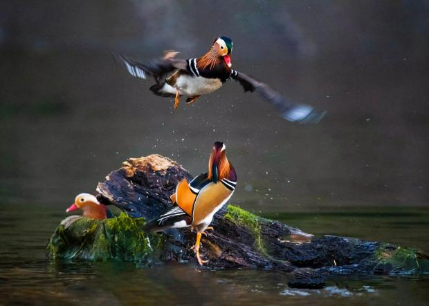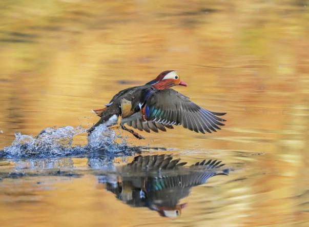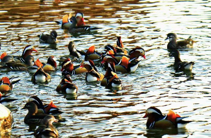 鸳鸯(Aix galericulata):属雁形目鸭科鸳鸯属,又被称为中国官鸭、邓木鸟等等。被列入《世界自然保护联盟濒危物种红色名录》(IUCN)——无危(LC)和中国《国家重点保护野生动物名录》二级。