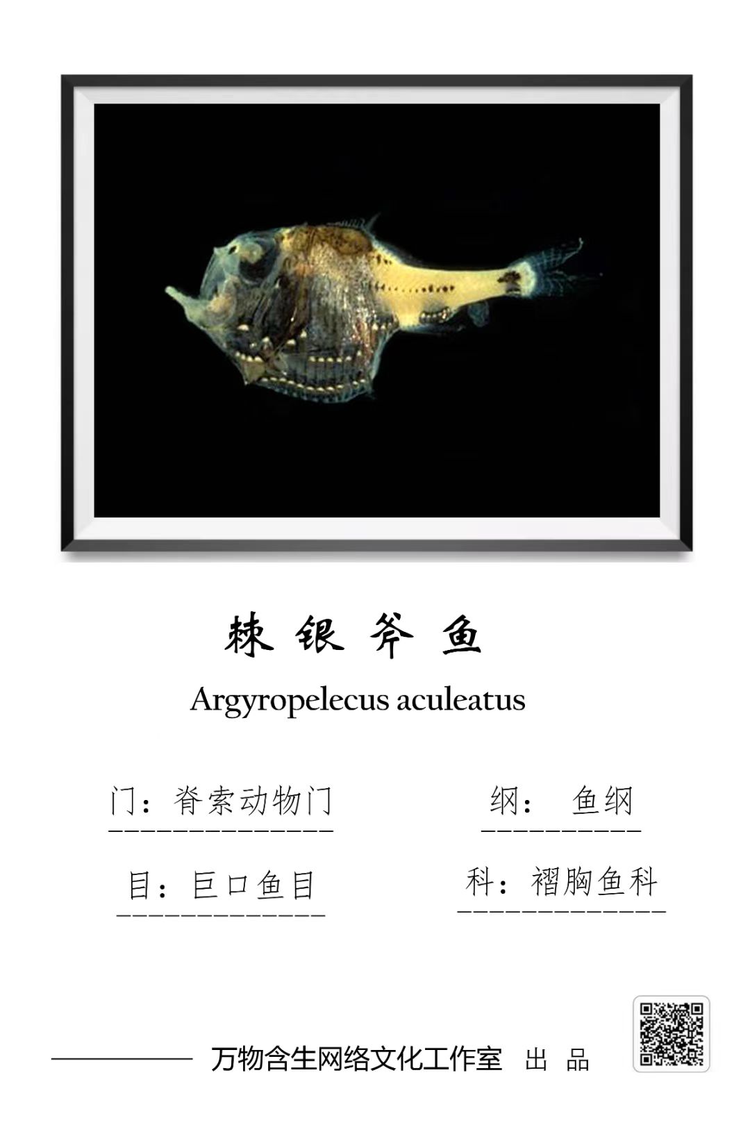外形:鱼体极侧扁,头及躯干高。眼大,口与身体几乎垂直。体为亮银色,眼呈筒状突起,背鳍前有一三角形透明骨板称为背刀。腹部、臀前、臀部及尾部皆有发光器。标准体长达15mm以上的成鱼才具有发育完全的发光器。