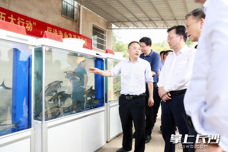 (长沙晚报供稿)在透明的玻璃展示缸中,杂交翘嘴鲂、合方鲫、湘军鳊、湘军抗病草鱼等悠闲地游弋着——这些都是中国工程院院士刘少军领衔的淡水鱼类发育生物学国家重点实验室研制出来的优质品种。时值仲夏,正是鱼类繁殖育种时节,今天下午,岳麓山水产种业创新中心—乌龙渔场基地暨刘少军院士团队工作室在素有“北盛仓”美誉的浏阳市北盛镇揭牌。