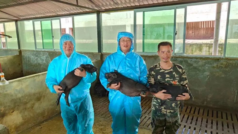 这是印遇龙(中)和农民在一起展示黑猪。受访者供图